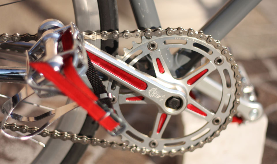 This racing bike, converted to a single speed, is from the early 70s and was originally a celerifere. Let me explain: FM came to us with an old rust colored two wheeler (or maybe it was just rust) Once we disassembled her we recognized that she was unsuitable for the conversion we wanted.